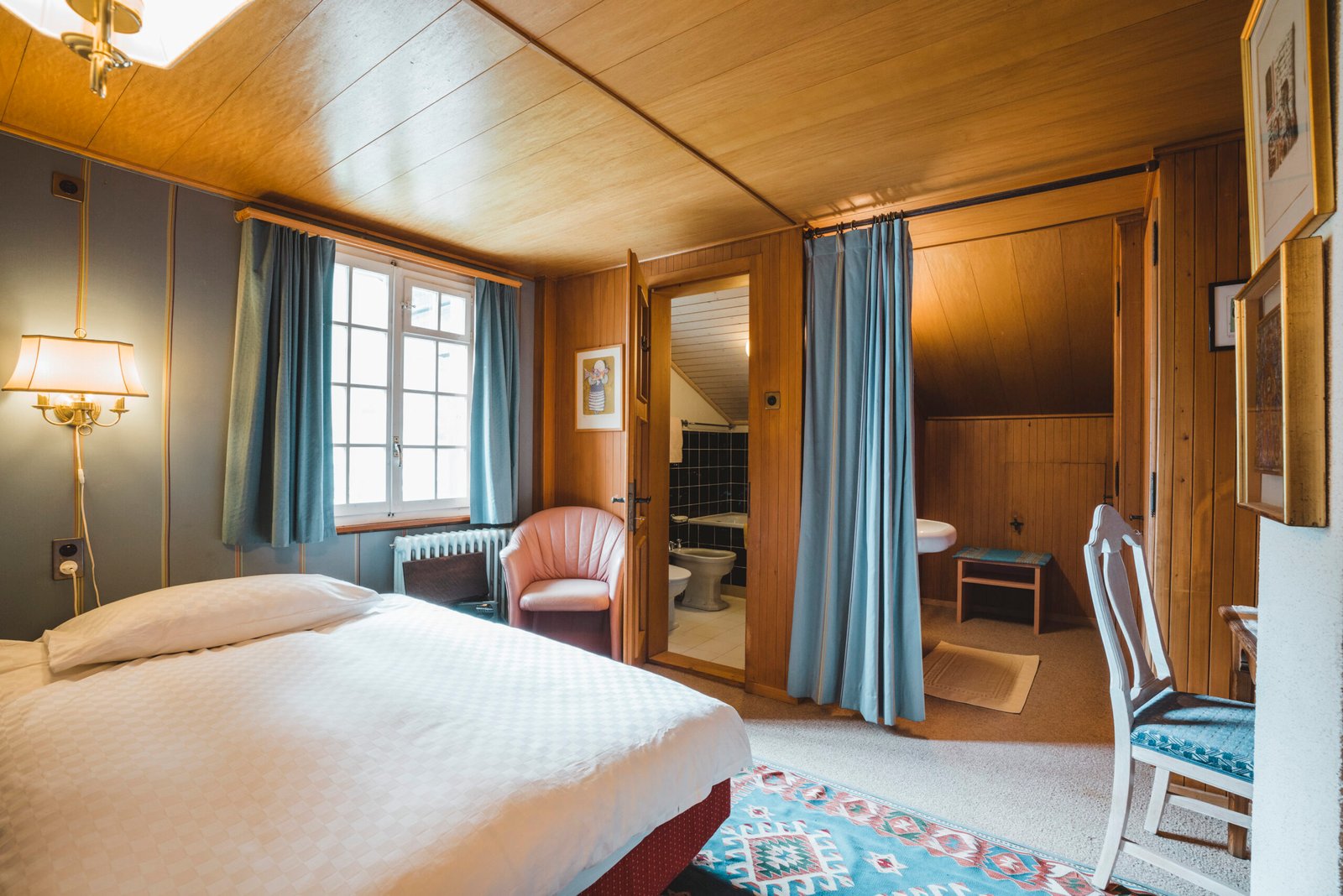 This cozy room is equipped with a queen-size bed and a private bathroom. From the window you can look out over the village of Zermatt.